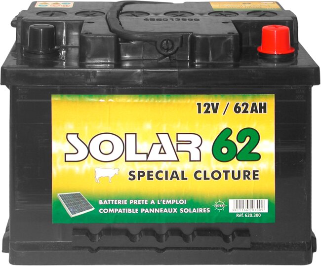 12V/62Ah, adapté pour l'alimentation des clôtures électriques.